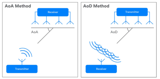 最新藍(lán)牙標(biāo)準(zhǔn)(5.1)允許系統(tǒng)使用天線陣列來確定通信方向(圖3)。使用天線陣列的單個設(shè)備可以與任何其他藍(lán)牙設(shè)備一起確定彼此的相對方向。這是通過測量到達(dá)角(AoA)或離開角(AoD),這取決于通信的方向和哪個設(shè)備有天線陣列。